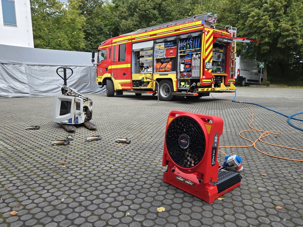 Zur Unterstützung des Innenangriffs wurden parallel Belüftungsmaßnahmen vorbereitet und eine weitere Schlauchleitung in Bereitstellung gebracht. Die Maschine wurde ins Freie getragen, dort nochmals abgelöscht und mit einer Wärmebildkamera sorgfältig kontrolliert. Auch der betroffene Hallenbereich wurde mehrfach überprüft, bevor abschließend die Belüftung des Gebäudes durchgeführt wurde.