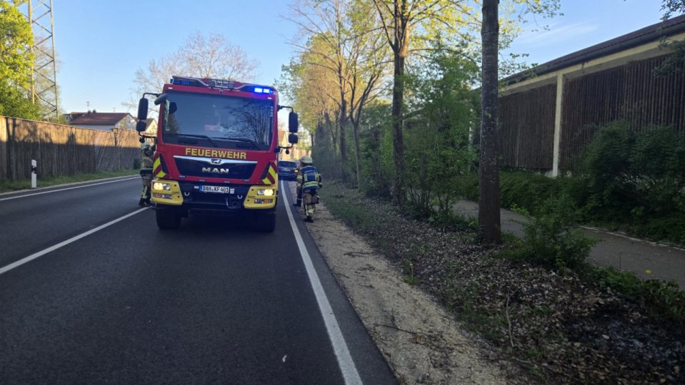Der nächste Einsatz ließ dann auch nicht lange auf sich warten. Am Abend ging es zu einem Böschungsbrand in die Bajuwarenstraße. Kurz vor dem Feuerwehrhaus brannte etwas Gestrüpp am Fahrbahnrand, ursächlich durch eine weggeworfene Zigarettenkippe. Bei den trockenen Witterungsbedingungen kann sich ein Feuer schnell ausbreiten, hier war zügiges Eingreifen gefragt. Der Schnellangriff unseres 1. HLF kam zum Einsatz, die Arbeiten waren nach einer kurzen Nachkontrolle mit der Wärmebildkamera dann auch zügig abgeschlossen.