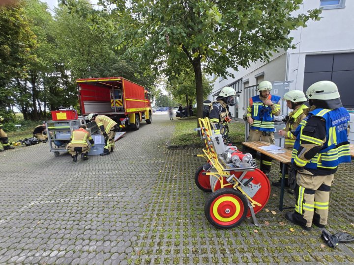 Zur Unterstützung des Innenangriffs wurden parallel Belüftungsmaßnahmen vorbereitet und eine weitere Schlauchleitung in Bereitstellung gebracht. Die Maschine wurde ins Freie getragen, dort nochmals abgelöscht und mit einer Wärmebildkamera sorgfältig kontrolliert. Auch der betroffene Hallenbereich wurde mehrfach überprüft, bevor abschließend die Belüftung des Gebäudes durchgeführt wurde.
