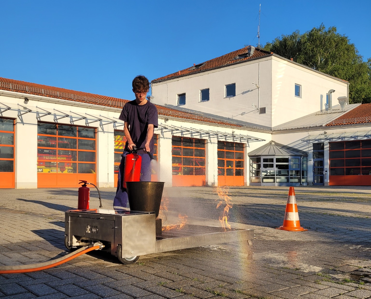 Moritz hatte parallel dazu eine Unterrichtseinheit der modularen Truppausbildung mit unseren Nachwuchs-Feuerwehrlern durchgeführt, die Grundlagen der Verbrennung stand auf dem Lehrplan. Neben der Theorie wurde auch praktisch im Hof mit einem Löschsimulator trainiert.Unsere Jugend ist fleißig mit den Vorbereitungen zum Siedlerfest-Umzug beschäftigt, am Anhänger wird derzeit noch fast täglich gebastelt und geschraubt. Morgen Mittag kann es dann endlich losgehen.