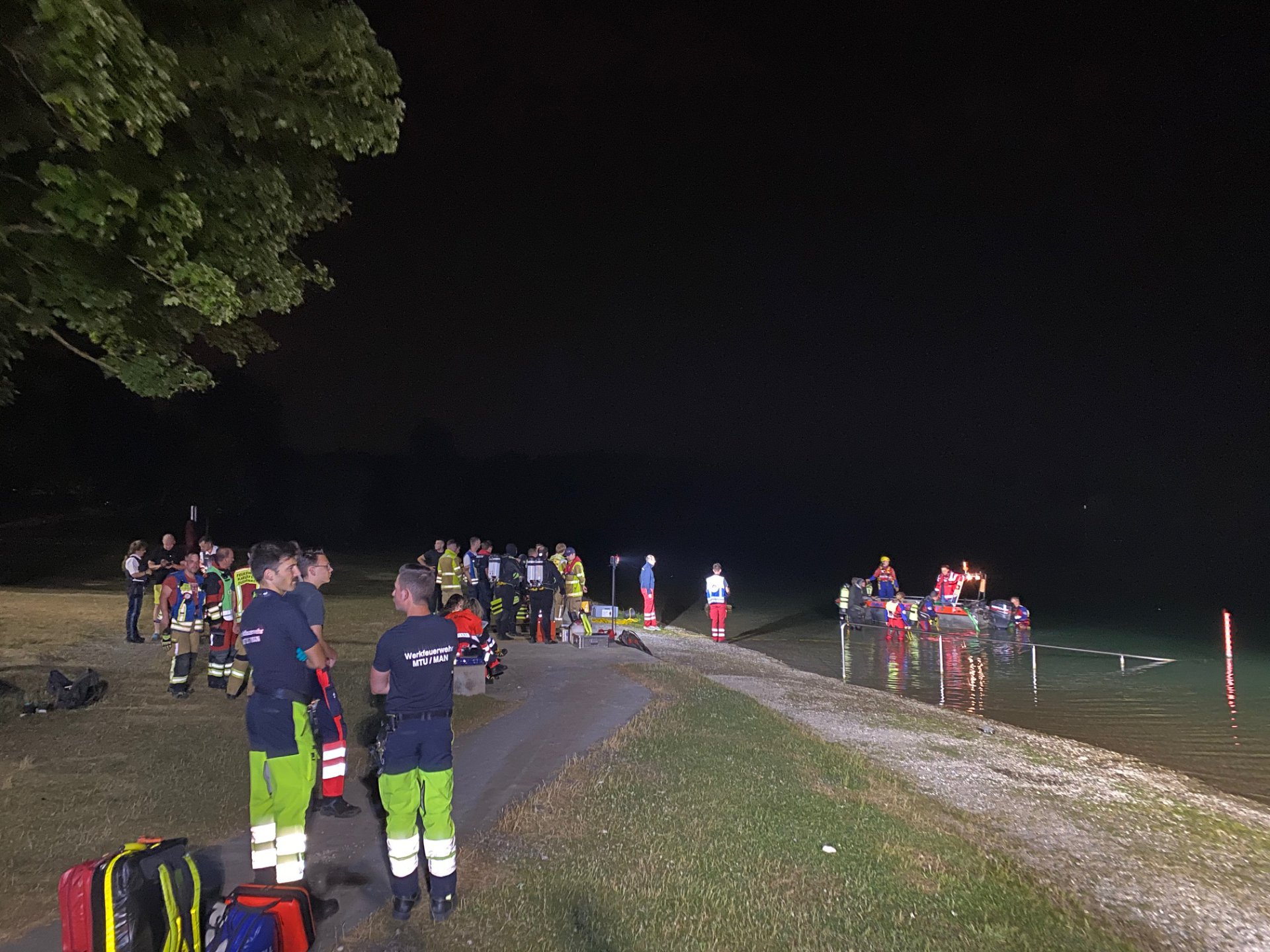 Unsere Einsatzkräfte unterstützen die Vermisstensuche zunächst durch ein großflächiges Ausleuchten der Einsatzstelle, desweiteren wurden Schwimmretter in Bereitschaft gestellt. Im weiteren Verlauf wurde der komplette Uferbereich des Sees durch die Feuerwehr Karlsfeld abgesucht und die Einsatzleistung Feuerwehr durch unseren ELW eingerichtet. Das Boot kam für Transportaufgaben zum Einsatz, unter anderem wurden Einsatztaucher, Wasserretter und diverses Material in Absprache mit den anderen Hilfsorganisationen verbracht.